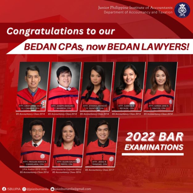 BEDAN CPAs, NOW BEDAN LAWYERS! News & UpdatesBy San Beda Alumni AssociationApril 27, 2023Leave a commentYou all made us proud when you became CPAs. now, youve made us prouder belonging to the Bedan race. Continue raising the Bedan flag higher by making a difference in your service to others. – Dr. Joffre M. Alajar