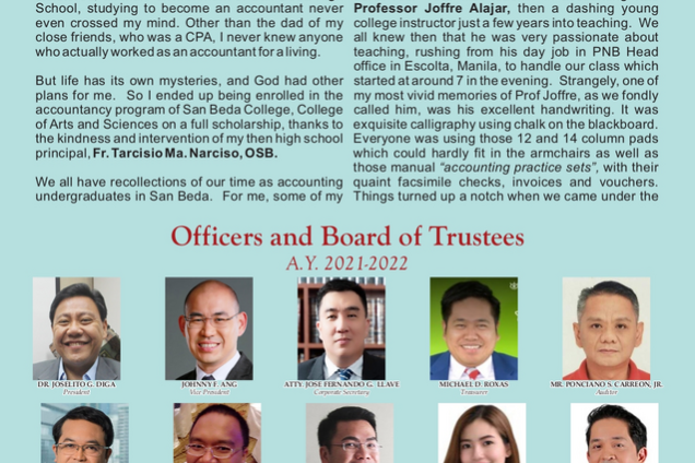 https://online.pubhtml5.com/oaodv/panx/’ Read the latest issue of The Beda Alumnus featuring the Bedan Servant Leaders of various Alumni Association of San Beda University.