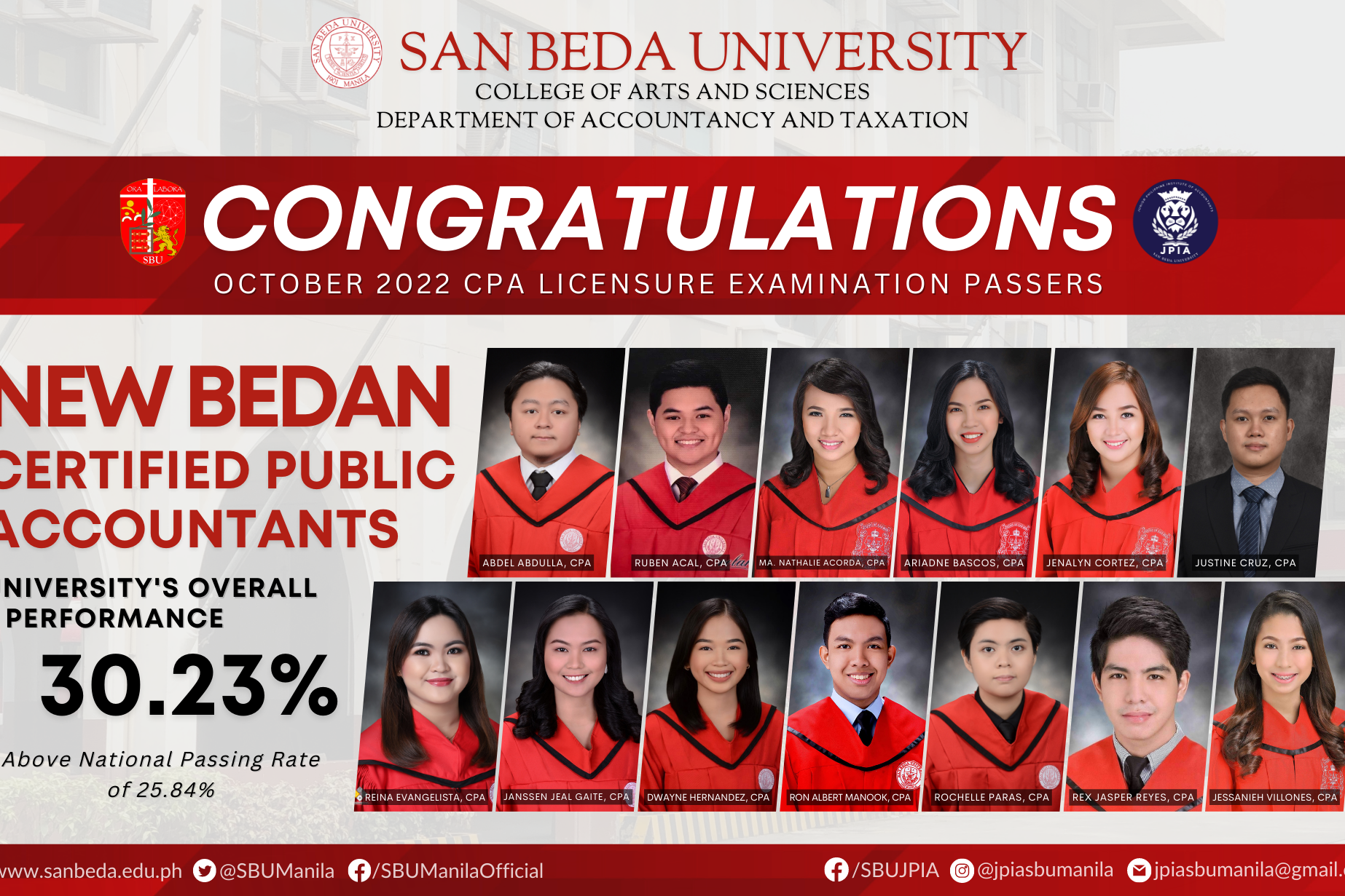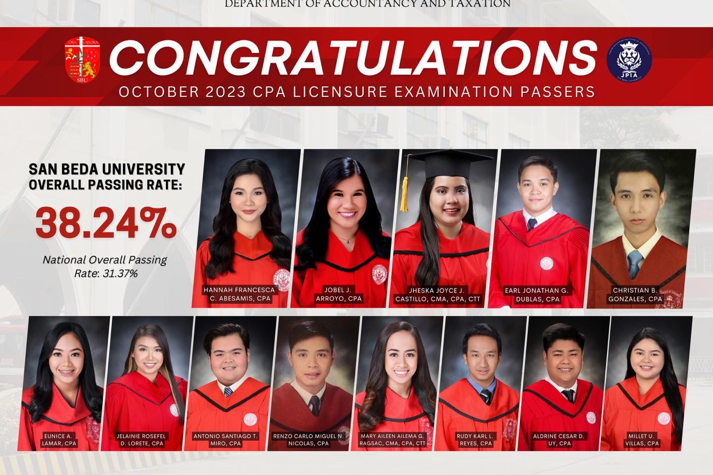 Congratulations because we are acknowledging and commending their feat to pass the CPALE! San Beda University obtained a 41.30% OVERALL PERFORMANCE above the 30.36% NATIONAL OVERALL PASSING RATE in the…