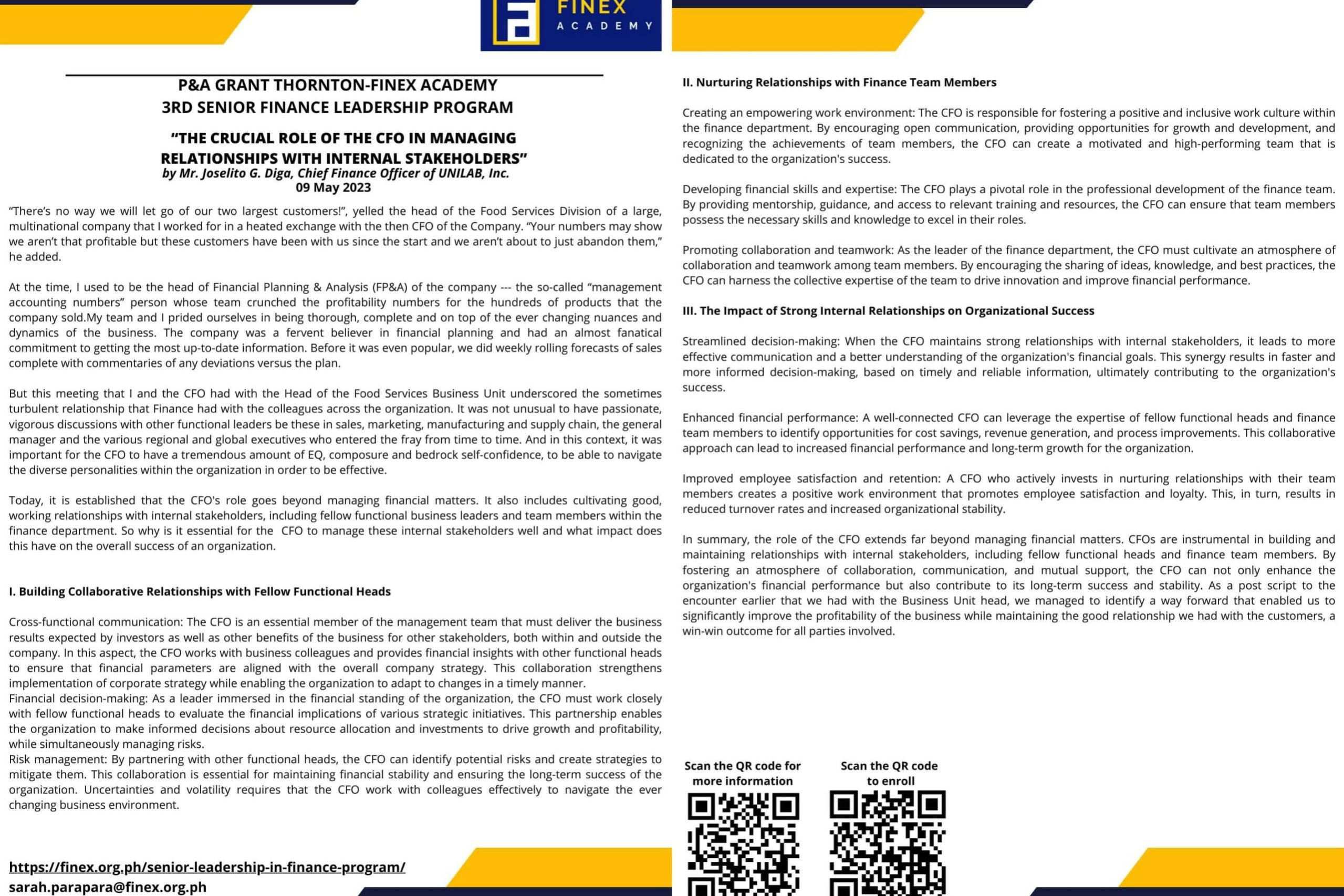 Mr. Joselito Diga, Chief Finance Officer of UNILAB Inc. writes for the Senior Finance Leadership Program of the FINEX Academy: For more information, please check our website: https://finex.org.ph/senior-leadership-in-finance-program/ Enroll now…