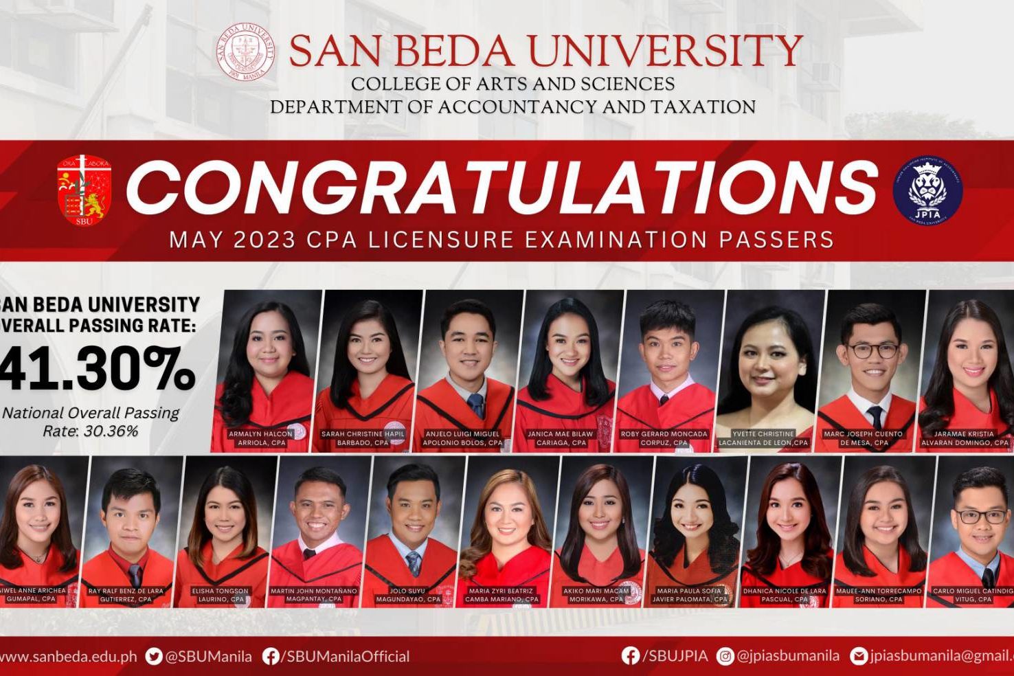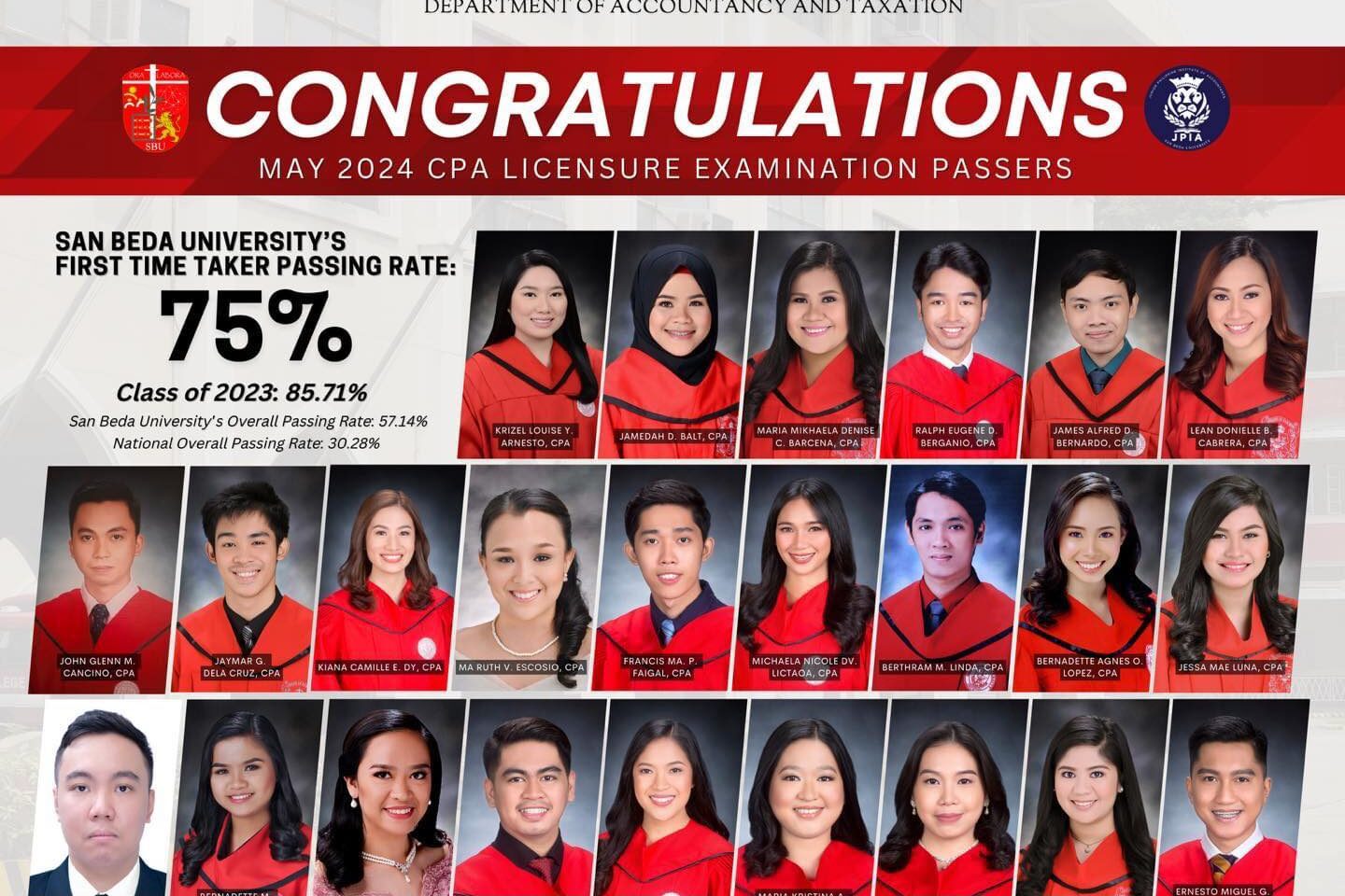 Presenting the ๐๐๐ฌ๐ฌ๐๐ซ๐ฌ ๐จ๐ May 2023 ๐๐๐ซ๐ญ๐ข๐๐ข๐๐ ๐๐ฎ๐๐ฅ๐ข๐ ๐๐๐๐จ๐ฎ๐ง๐ญ๐๐ง๐ญ ๐๐ข๐๐๐ง๐ฌ๐ฎ๐ซ๐ ๐๐ฑ๐๐ฆ๐ข๐ง๐๐ญ๐ข๐จ๐ง! Your journey has not been an easy one, but you surpassed them all, and that makes San Beda University…