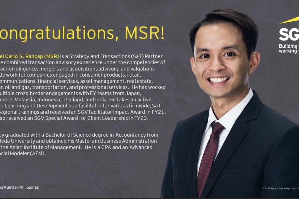 The San Beda Accountancy Alumni Association (SBUAcAA) would like to congratulate Miguel Carlo S. Rancap (MSR) for being admitted as Partner at SGV & Co.