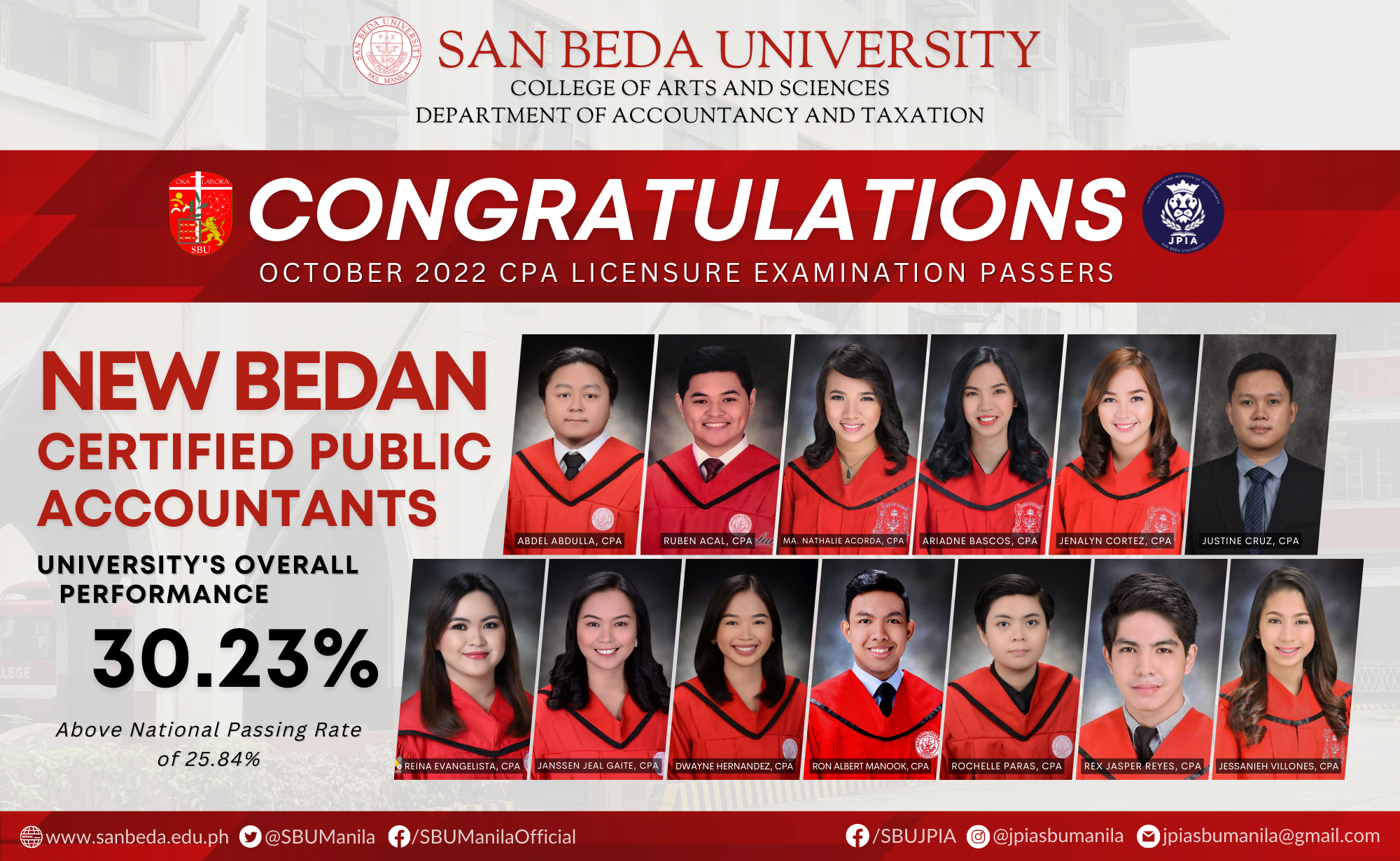 The San Beda Junior Philippine Institute of Accountants (JPIA-SBU) proudly presents the 𝐏𝐚𝐬𝐬𝐞𝐫𝐬 𝐨𝐟 𝐎𝐜𝐭𝐨𝐛𝐞𝐫 𝟐𝟎𝟐𝟐 𝐂𝐞𝐫𝐭𝐢𝐟𝐢𝐞𝐝 𝐏𝐮𝐛𝐥𝐢𝐜 𝐀𝐜𝐜𝐨𝐮𝐧𝐭𝐚𝐧𝐭 𝐋𝐢𝐜𝐞𝐧𝐬𝐮𝐫𝐞 𝐄𝐱𝐚𝐦𝐢𝐧𝐚𝐭𝐢𝐨𝐧! Your journey has not been an easy one, but you surpassed them all, and that makes San Beda University proud of you!