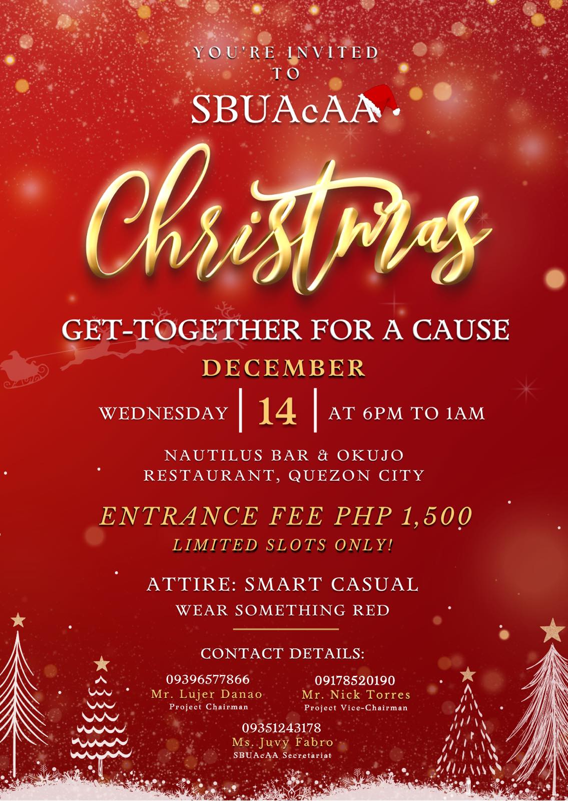 The San Beda University Accountancy Alumni Association (SBUAcAA) will hold its first onsite activity, the Christmas Get-Together for a Cause. This event will be held on Wednesday, 14 December 2022, 6pm at Nautilus Bar and Okujo Restaurant Quezon City. Aside from being a fellowship activity for accountancy graduates, this event will also be an opportunity to know the SBUAcAA. Proceeds from this activity will be used to fund scholarship grants and faculty development programs.